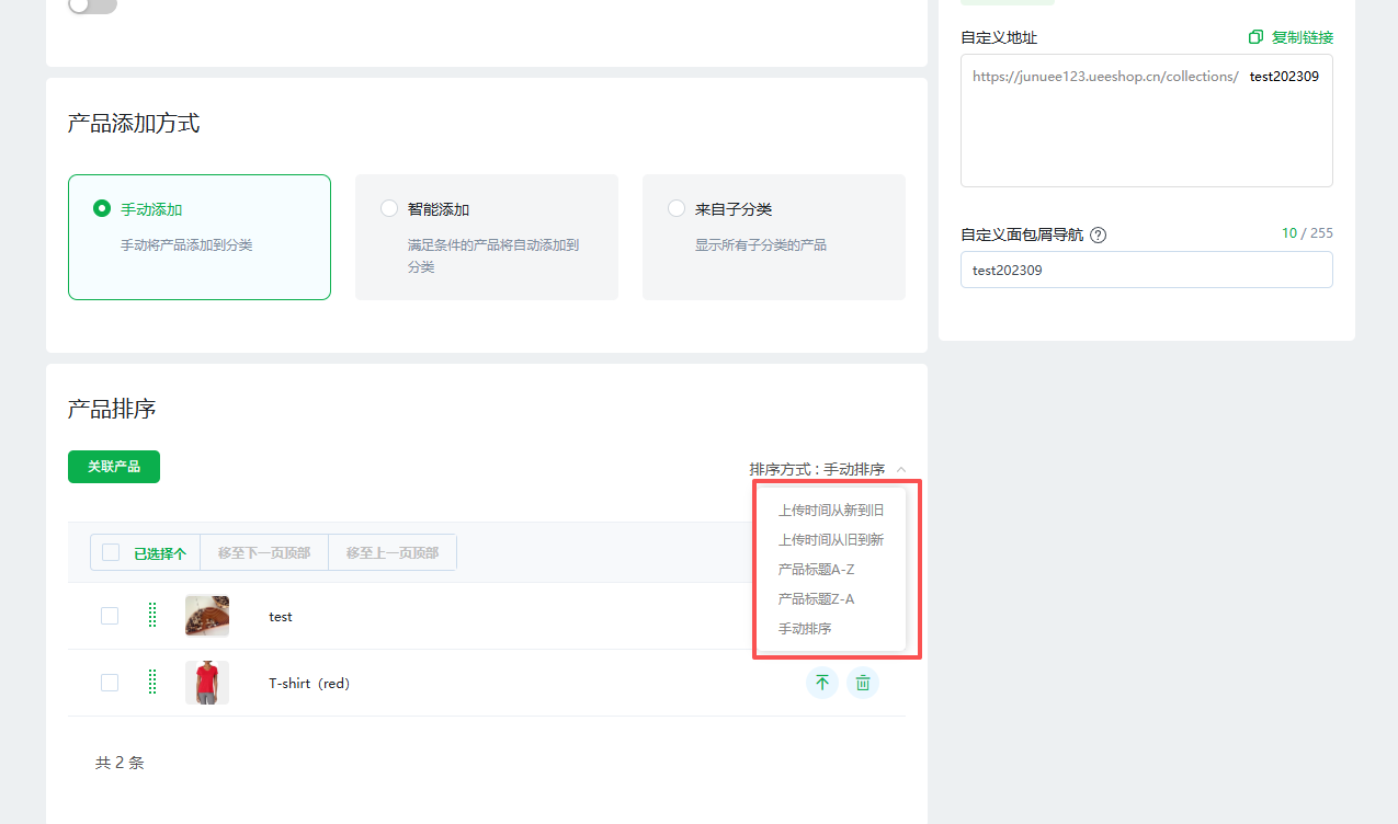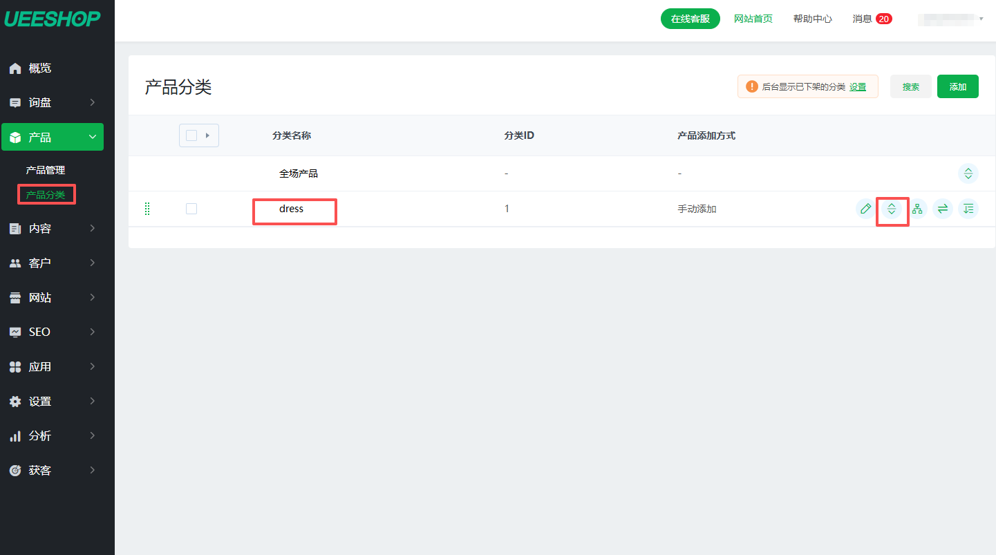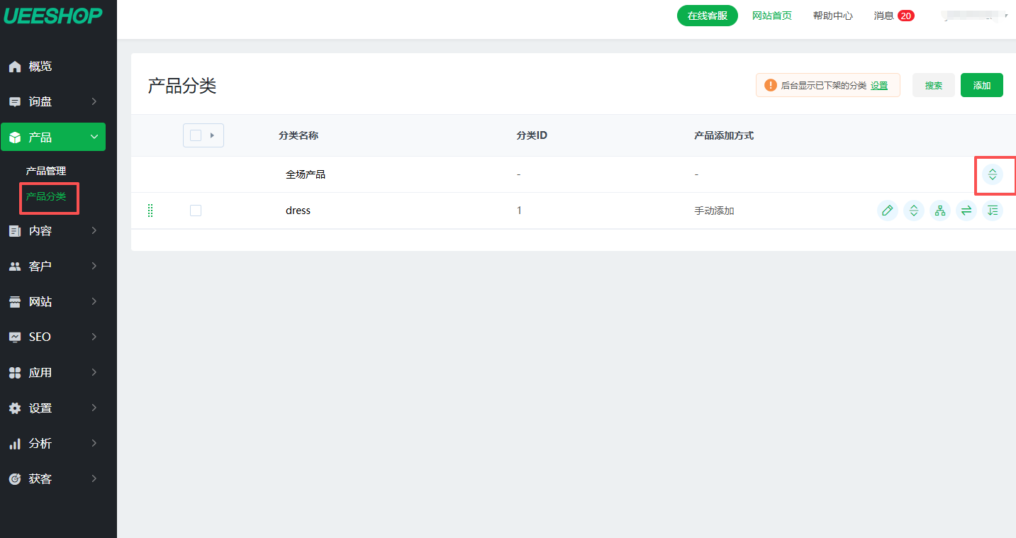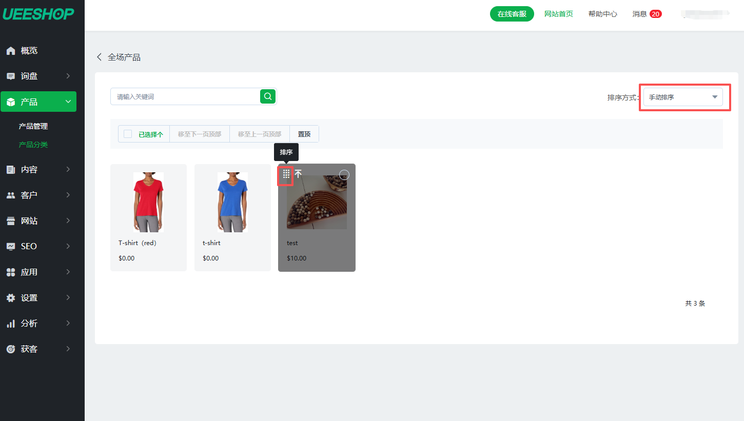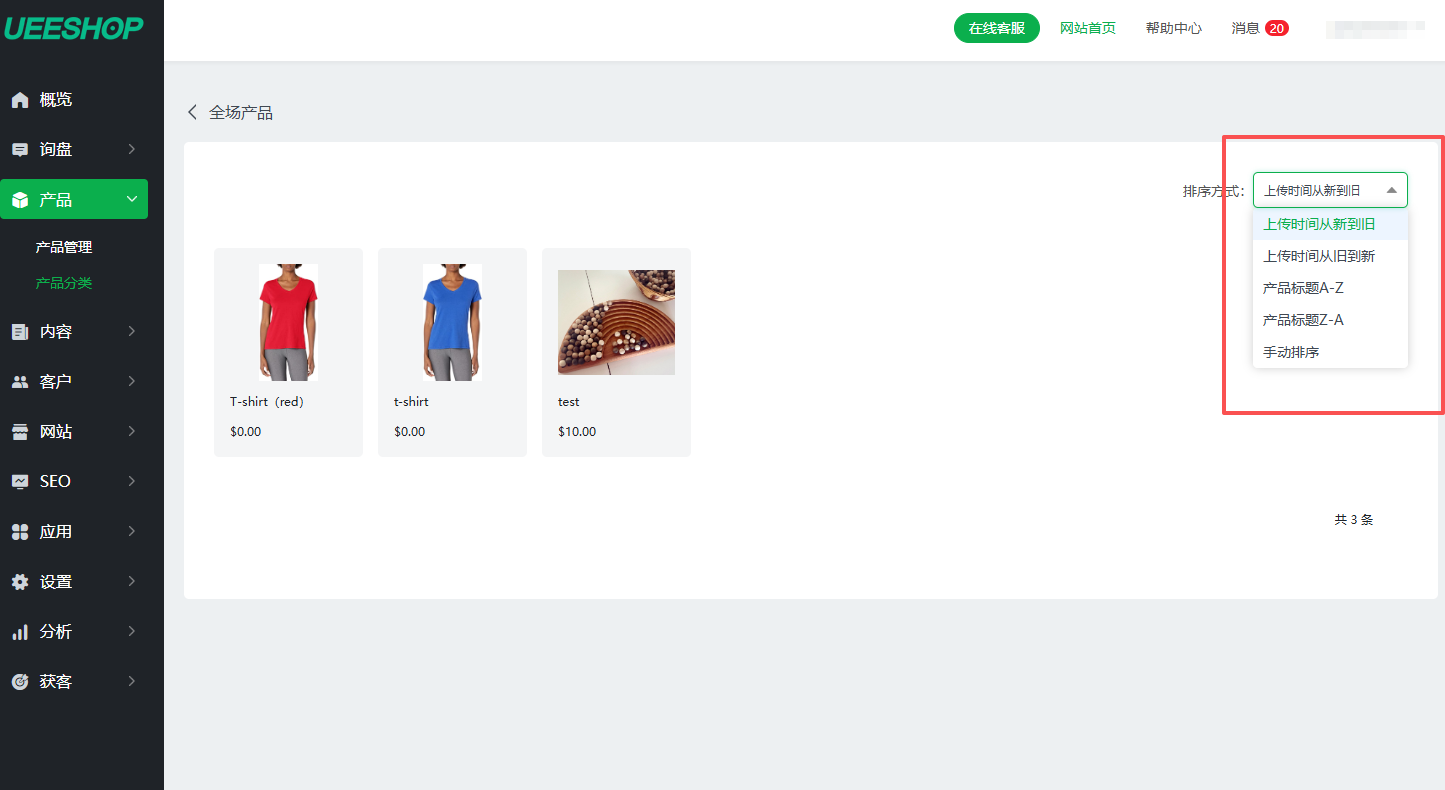 (1)登录网站后台,点击工具栏左侧,产品--产品分类,点击全场产品右侧的排序按钮,可以对总产品列表页进行产品排序,即链接为https://XXX.com/products/