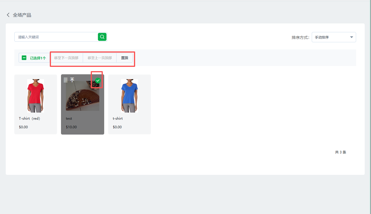(3)如果选择手动排序方式,光标移动到具体产品的图标,点击可进行产品的拖动